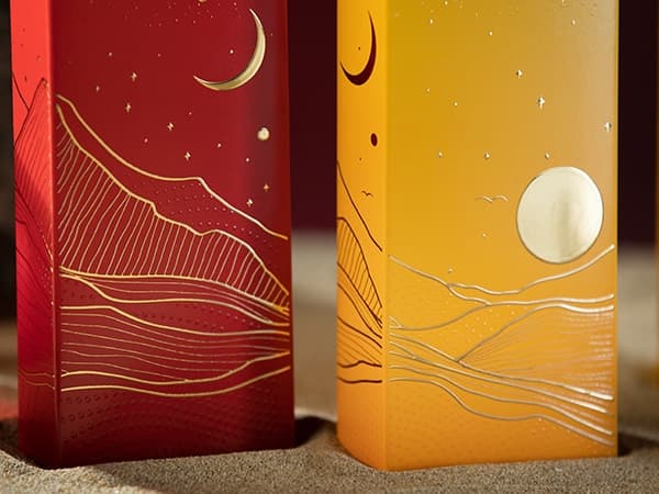 Queste due scatole con fondo a incastro sono state progettate per adattarsi perfettamente l’una all’altra, creando un forte impatto visivo. La funzione di chiusura posteriore della confezione consente di aprire facilmente le scatole, rendendole comode da usare per il cliente. I colori giallo e rosso delle scatole sono simbolici ed evocano un senso di ricchezza ed esclusività. Mentre il sole rappresenta calore, energia e vita, la luna simboleggia calma, serenità e mistero.