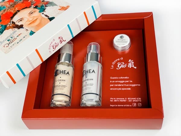 Il s’agit d’une précieuse boîte avec couvercle et fond avec double parois dans laquelle sont insérés, dans leurs calages, des produits pour les soins personnels de la ligne Rhea Cosmetics.