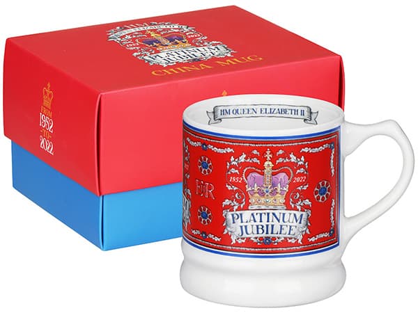 Esistono diverse varianti di gadget creati per i 70 anni di regno della regina Elisabetta. Qui sotto vi proponiamo una tazza più folcloristica, meno sobria, con l’immancabile cucchiaino per l’ora del tè.