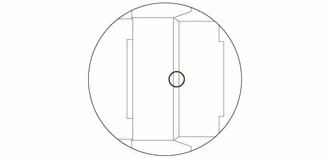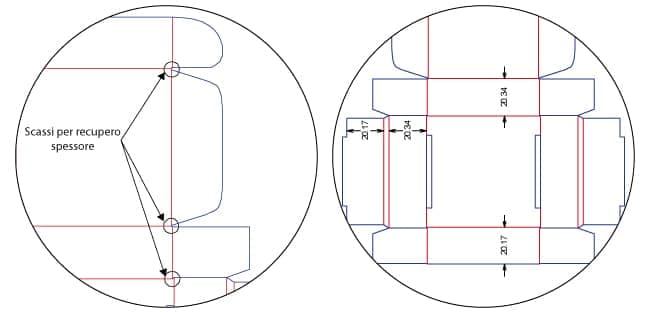 Come per tutte le tipologie di packaging, le componenti della confezione sono dimensionate a seconda dei vari aspetti strutturali della stessa. Nel caso della valigetta è possibile notare una differenza variabile dell’altezza in alcune zone della scatola: questa differenza è strettamente relazionata allo spessore del supporto utilizzato. Un altro tratto caratteristico è il disallineamento delle cordonature in alcuni punti, elemento necessario per creare appositi scassi per il recupero dello spessore. Tali accorgimenti servono per garantire la corretta chiusura e il corretto funzionamento dell’intera struttura.